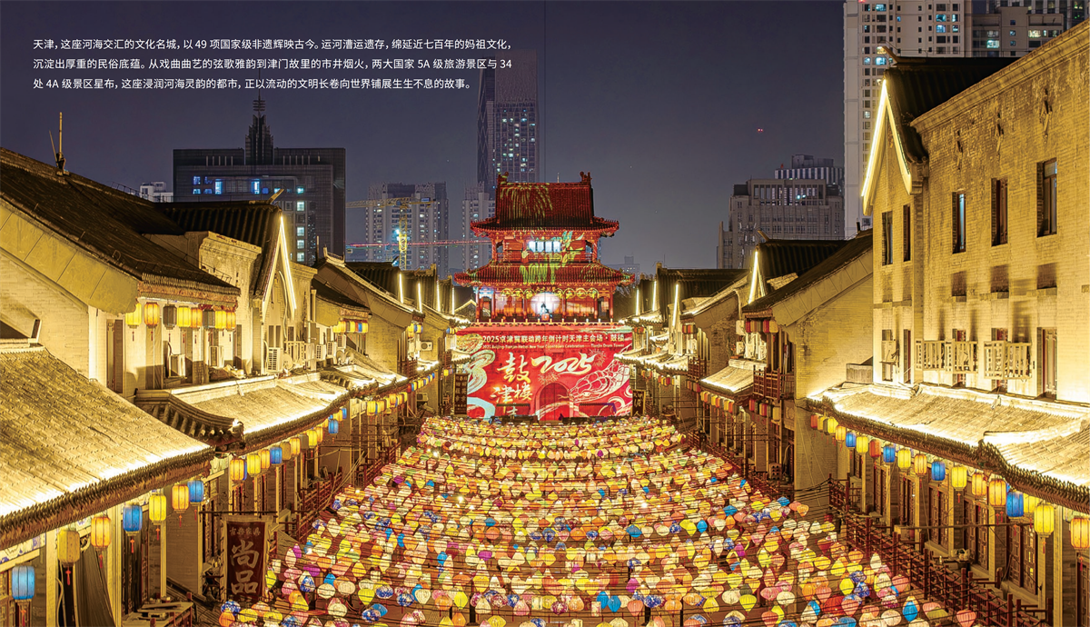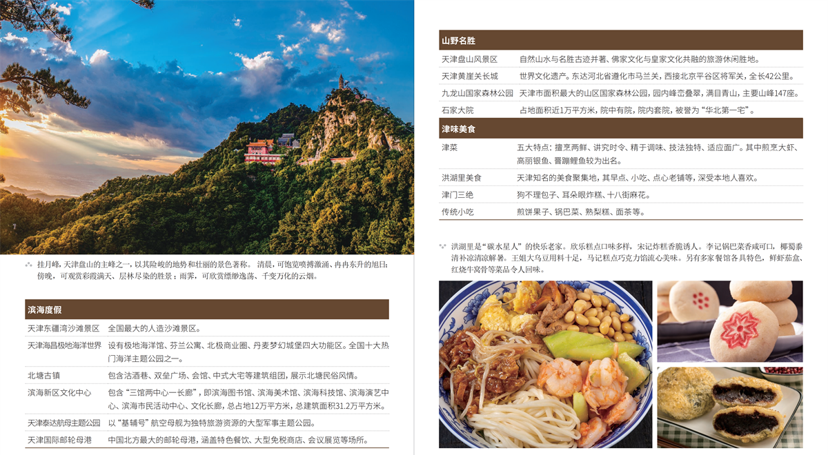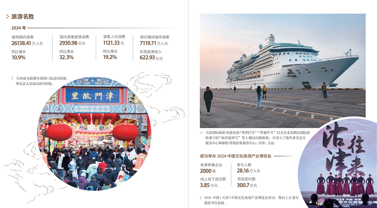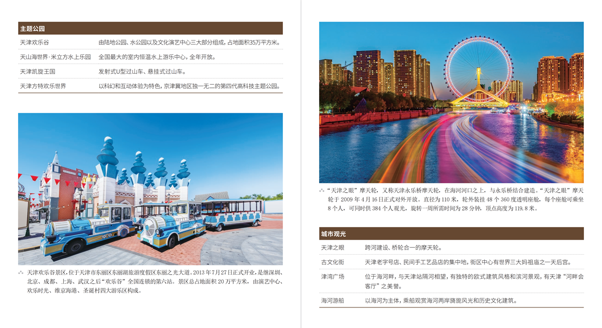 天津是四个中央直辖市之一、北方最大的沿海开放城市、国家历史文化名城和首批中国优秀旅游城市,拥有山、河、湖、海、泉、湿地等丰富的自然资源和浓缩近代历史、汇聚现代文明的人文旅游资源。土地总面积11966.45平方公里,疆域周长1291.149公里,其中海岸线长153.669公里,陆界长1137.48公里。东临渤海,北依燕山,西靠首都北京,距北京120公里,是拱卫京畿的要地和门户。天津是海河五大支流南运河、子牙河、大清河、永定河、北运河的汇合处和入海口,素有“九河下梢”“河海要冲”之称。天津以海纳百川之姿包容不同文化,吸引着国内外众多游客的到来。